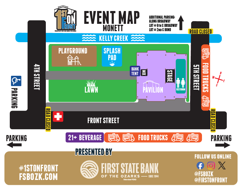 1ST ON FRONT is hosted in Downtown Monett Missouri at the Glen and Sharon Garrett Downtown Park on Front Street between 4th and 5th streets. The main stage is located beneath the 8,000-square-foot covered Jerry D. Hall Memorial Pavilion facing a large outdoor space. Food trucks will be setup along 5th and Front streets and traffic will be blocked on Front street and 5th street near the event. Free parking is available in lots to the southwest and east sides of the event. Additional parking is available along Broadway street, a parking lot at 6th street and Broadway street, and an additional parking lot at 2nd street and Bond street.